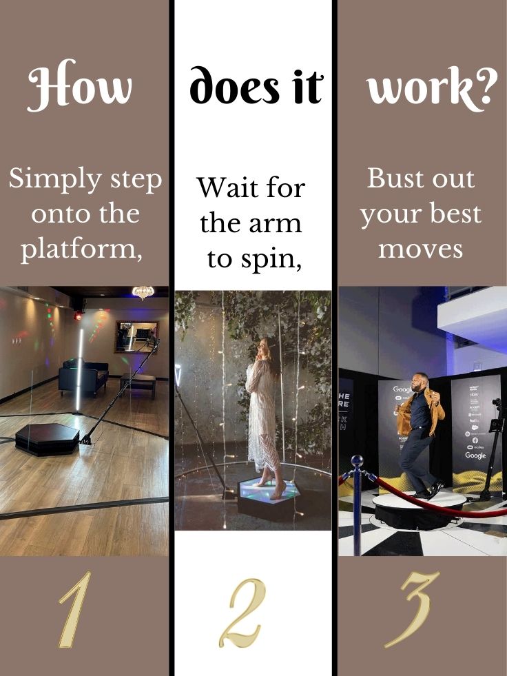 The 360 video booth captures you and your guests in a slow motion video effect while also taking in your surroundings.